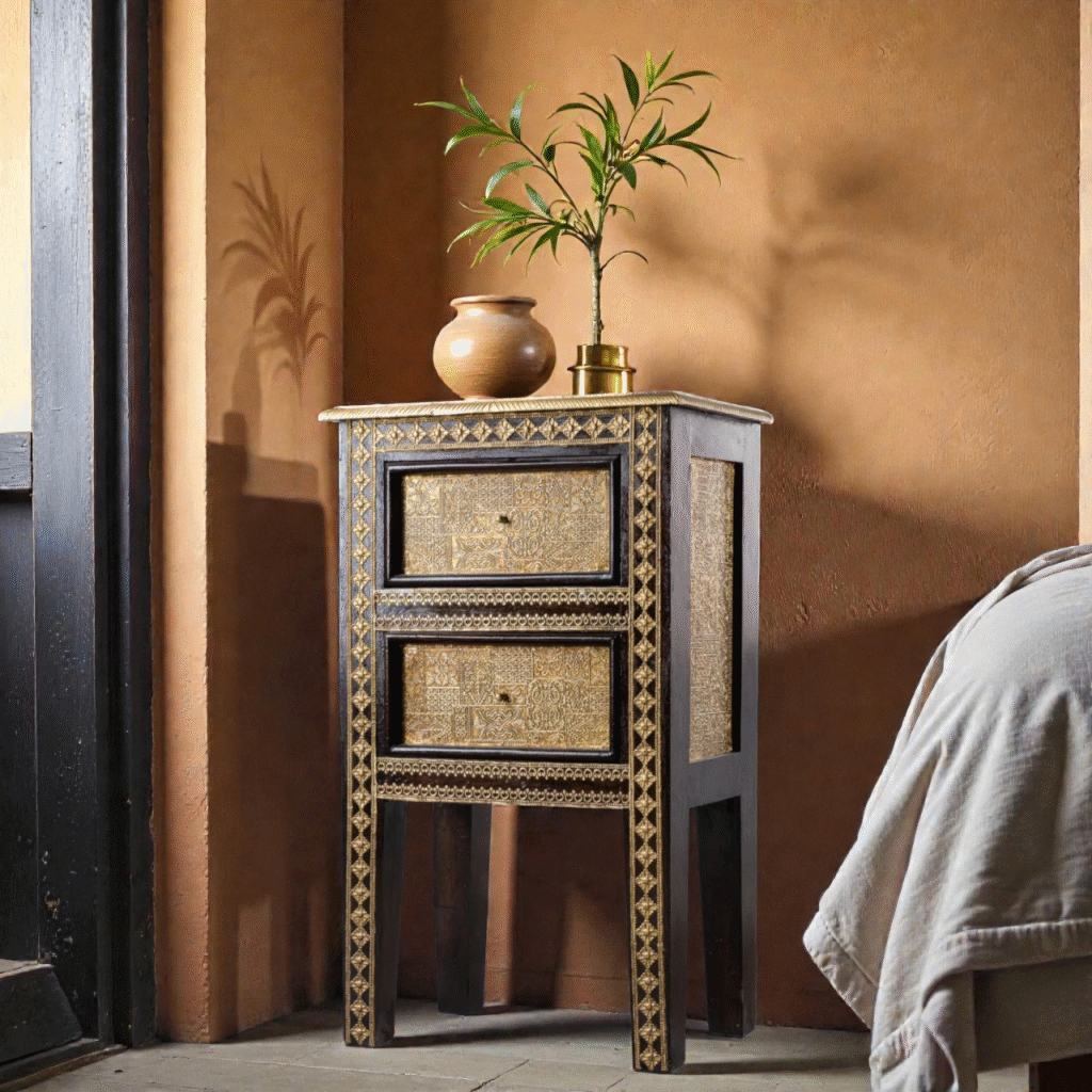 Unveil the perfect blend of nature and design with this handcrafted wooden nightstand. Featuring three textured drawers, each with a unique pattern—from geometric leaf motifs to a tiled wave and a delicate circular ring pull—the piece brings natural warmth and tactile intrigue to any bedroom. The sturdy frame is finished in a brushed brass base, adding a touch of industrial chic that complements modern, boho, and Scandinavian styles alike. Ideal for bedside essentials, it offers generous storage without compromising on style. ✨🪵🌿