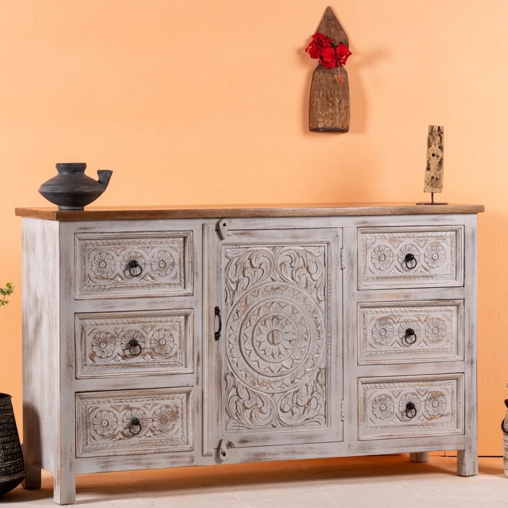 Elvayna – Hand-Carved Whitewashed Lowboard, Vintage Style (180cm) | Solid Wood TV Console & Storage Cabinet