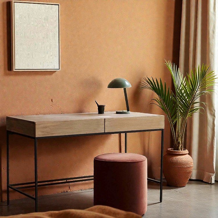 Its integrated storage drawer helps keep your workspace clutter-free, making it ideal for home offices, study rooms, or creative corners. The natural wood finish adds warmth, while the minimalist metal structure gives it a clean industrial look that fits effortlessly into modern, urban, and Scandinavian interiors.