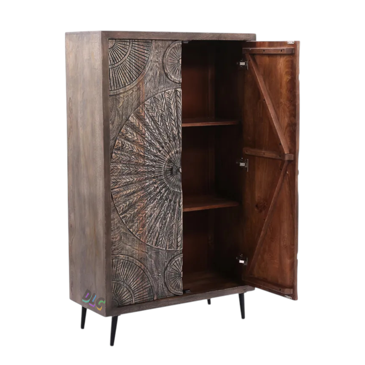 Bring timeless artistry and practical storage into your home with the Aarvaya Hand-Carved Solid Wood Storage Cabinet, a statement piece crafted for modern Indian interiors. Made from premium solid wood, this cabinet features an intricately carved geometric sunburst pattern that reflects skilled craftsmanship and heritage design.