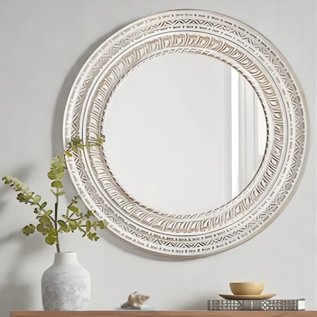 Perfect for Indian homes, the Meher wall mirror is available in multiple sizes, making it versatile for living rooms, bedrooms, hallways, or dressing areas. Crafted using natural and eco-friendly materials, it is an ideal choice for homeowners who appreciate sustainable décor with a cultural touch. Whether styled as a statement wall accent or a functional mirror, the Meher mirror delivers artistic beauty, handcrafted quality, and timeless appeal.