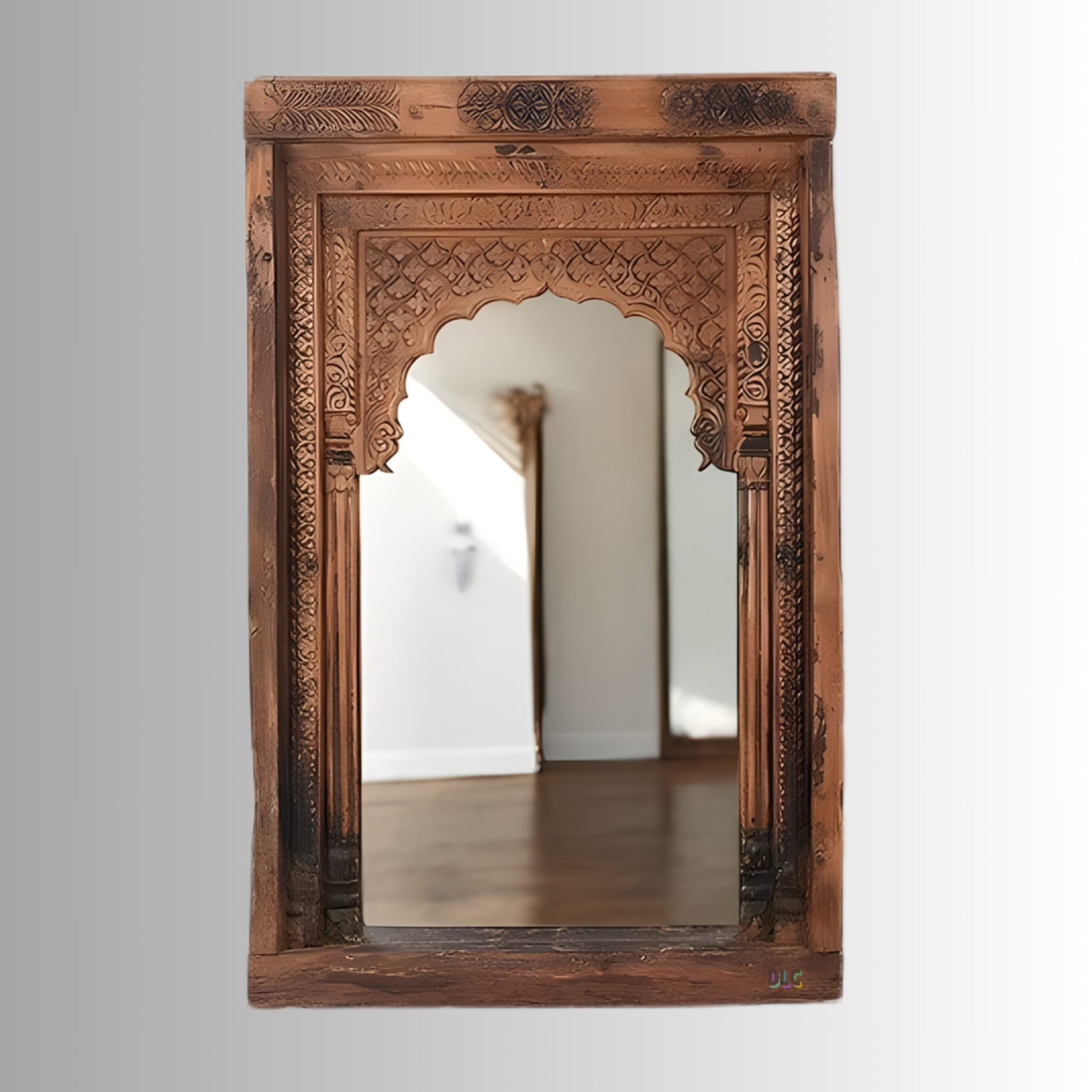 Add royal Indian heritage to your interiors with the Aranya Carved Jharokha Wall Mirror, a statement décor piece inspired by traditional Rajasthani architecture. Expertly handcrafted from premium mango wood, this mirror features intricate floral and arch carvings that reflect timeless craftsmanship and cultural elegance.