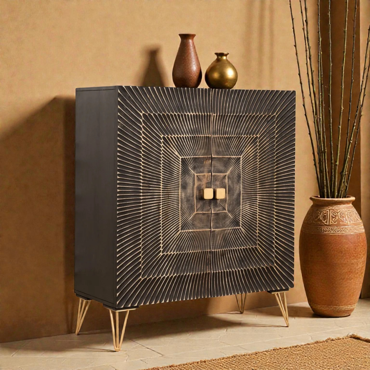 The Astra Noir Hand-Carved Mango Wood Cabinet is a perfect fusion of heritage craftsmanship and modern luxury. Handcrafted by skilled Indian artisans, this cabinet features a striking radial geometric carving that adds depth, texture, and character to your living space.