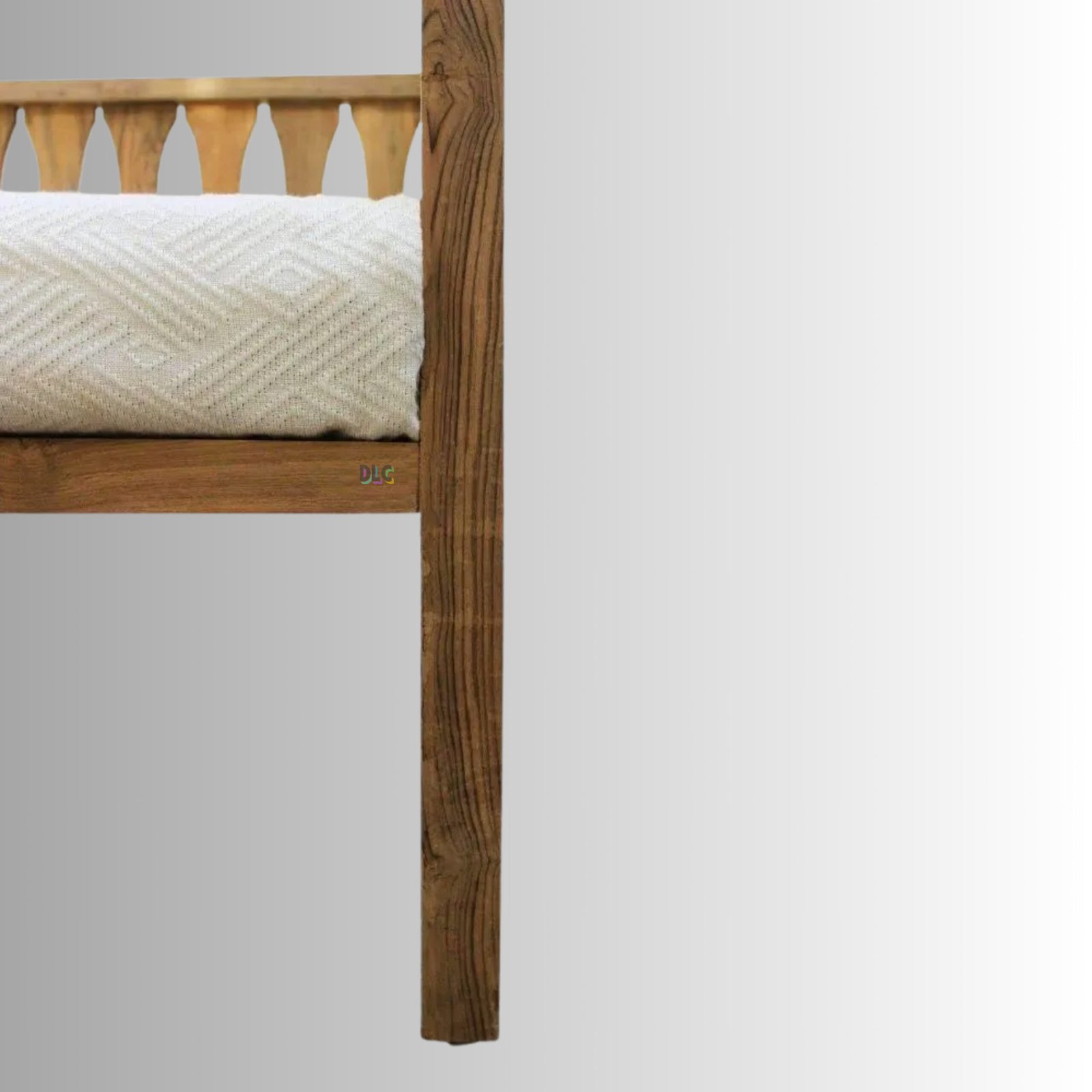 Designed in a daybed style, it offers both lounging and seating comfort, making it ideal for living rooms, lounges, guest rooms, or studio apartments. The wide cushioned seat paired with supportive wooden arm panels creates a relaxed yet elegant seating experience that fits seamlessly into modern, bohemian, and ethnic interiors.