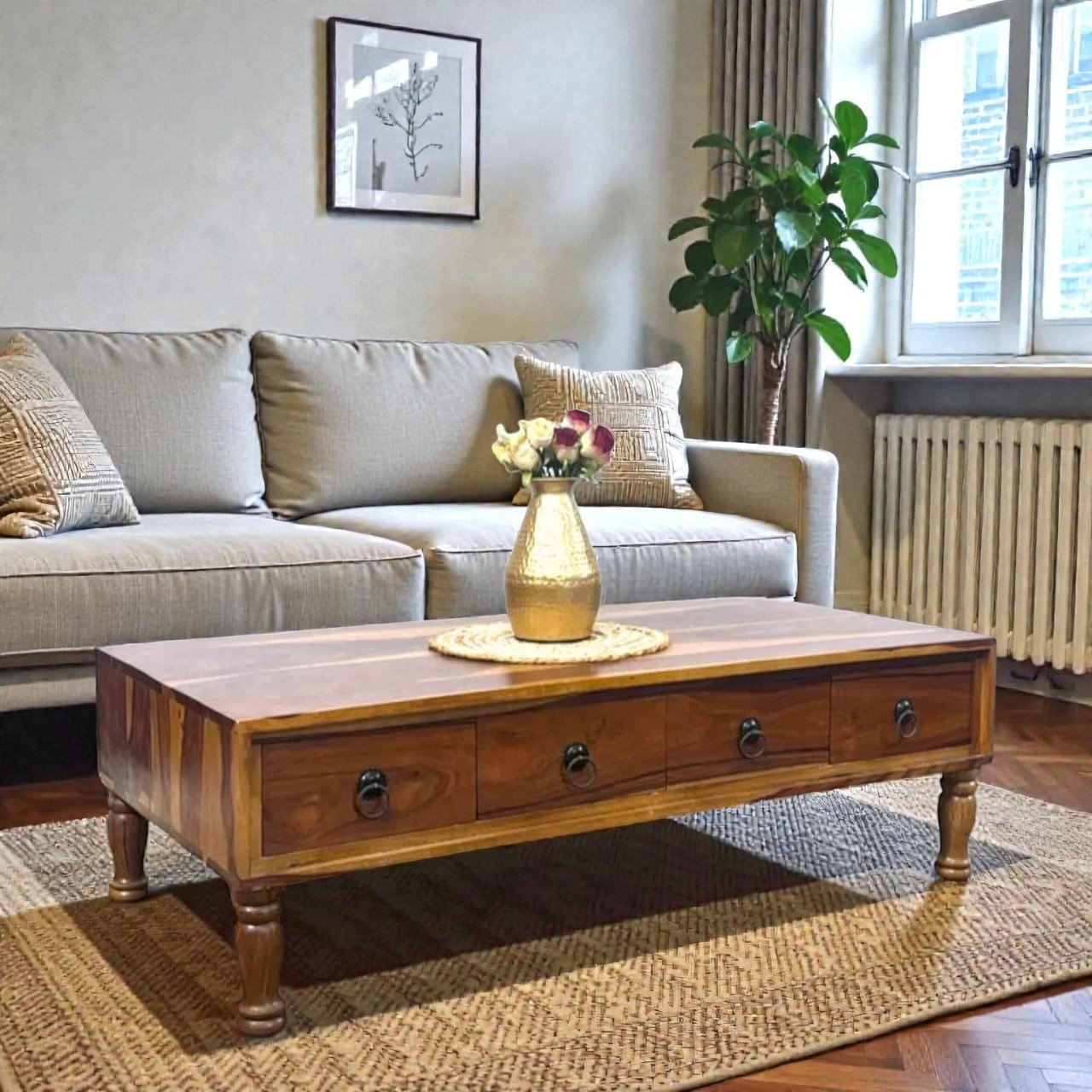 Elevate your living space with the Aurora Haven Solid Wood Coffee Table, a timeless centerpiece designed for comfort-focused and classic interiors. Crafted from premium solid wood, this coffee table features a clean rectangular silhouette paired with functional storage drawers, making it both elegant and practical.