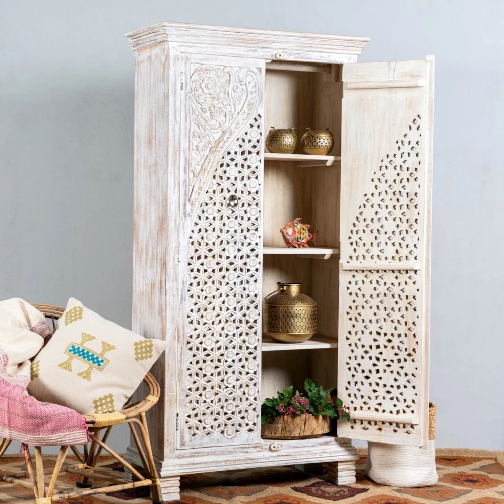 The Azmara Hand-Carved Mango Wood Cabinet (180 cm) is a striking Moroccan-inspired storage unit crafted from 100% solid mango wood, designed to bring artistic elegance and cultural richness into your interiors. Meticulously handcrafted by skilled artisans, this cabinet features intricate jali-style hand carving across its tall doors, creating a dramatic play of texture and depth. The soft whitewashed finish enhances the detailing while highlighting the natural grain of the wood, giving each piece a refined yet handcrafted character. Built with premium-quality solid wood, it offers exceptional strength and long-lasting durability.