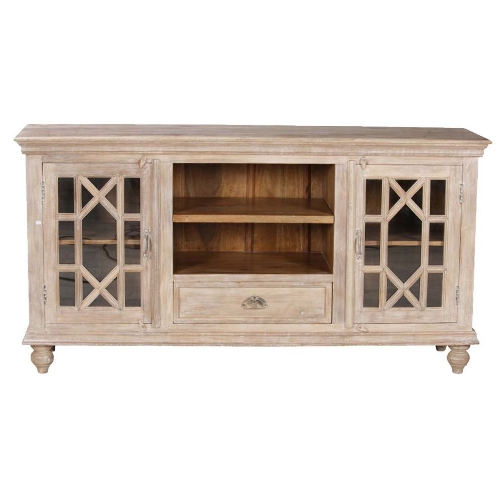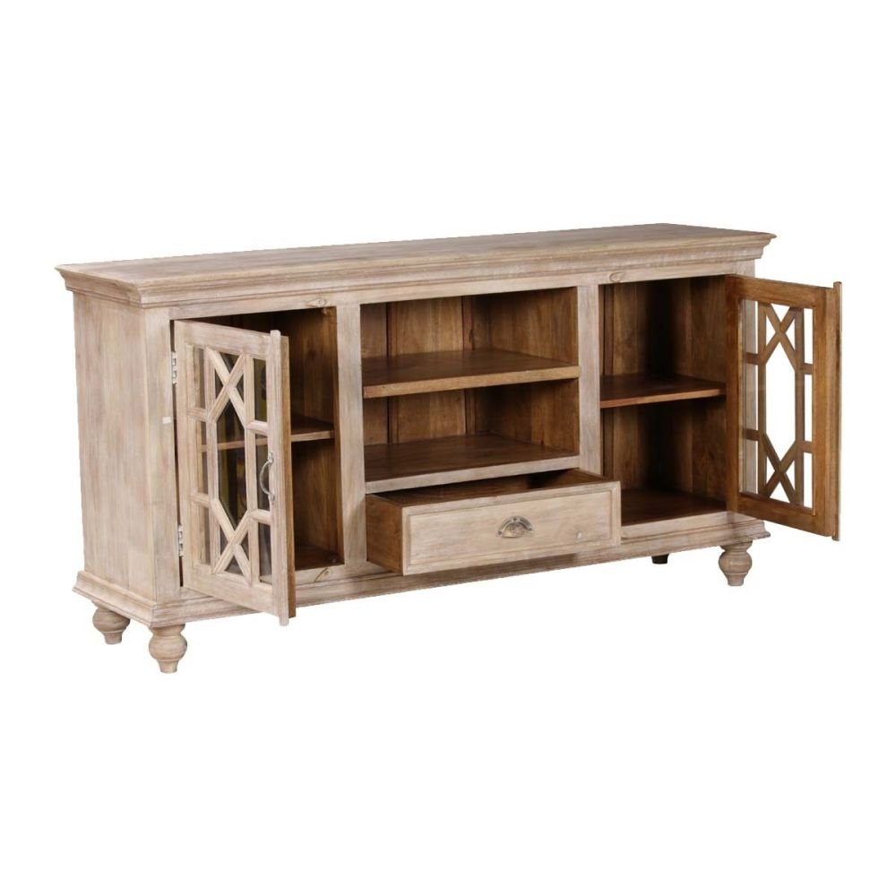 Carri Whitewash Solid Mango Wood Glass Door Cabinet | Handcrafted Storage Unit (62 × 14 × 32 in)