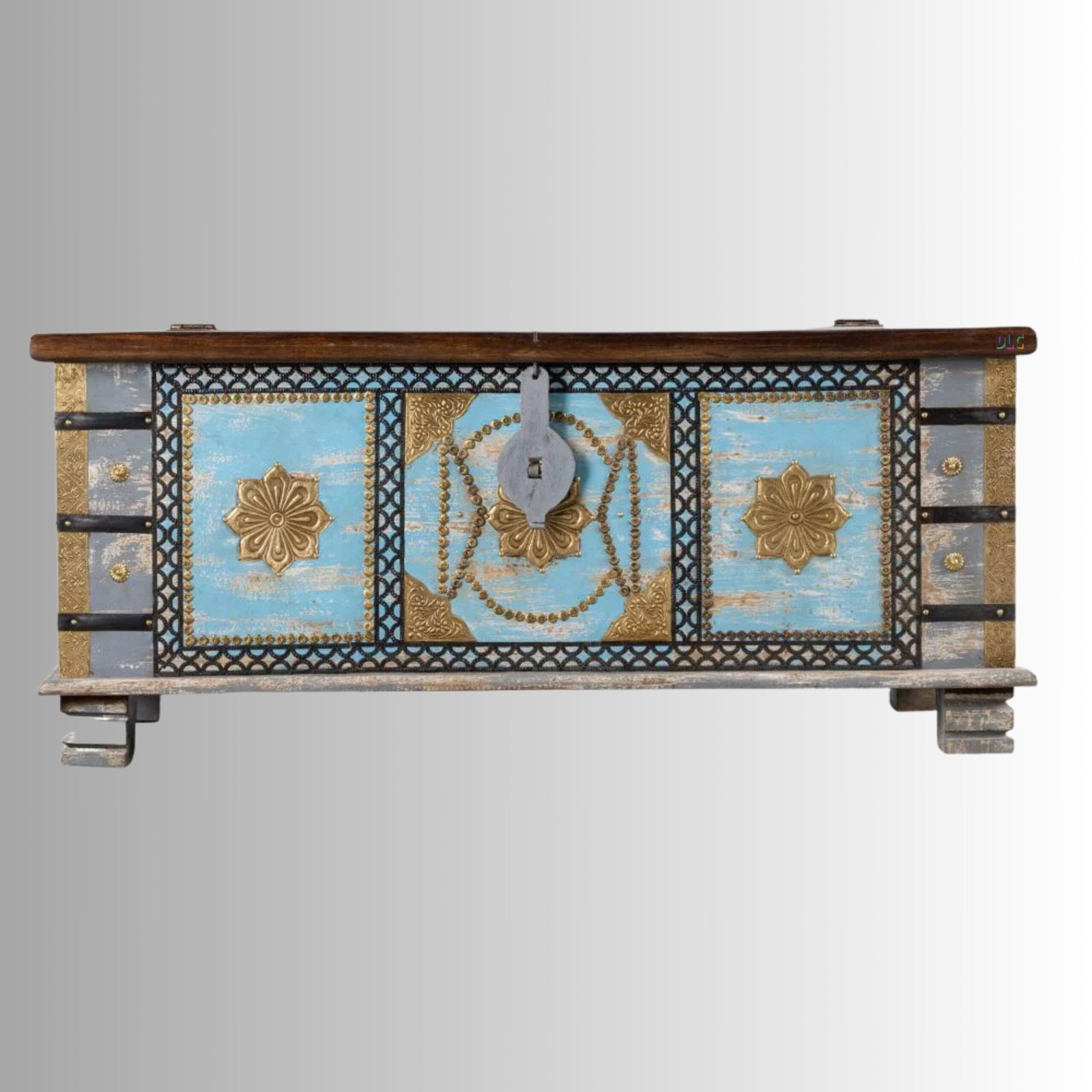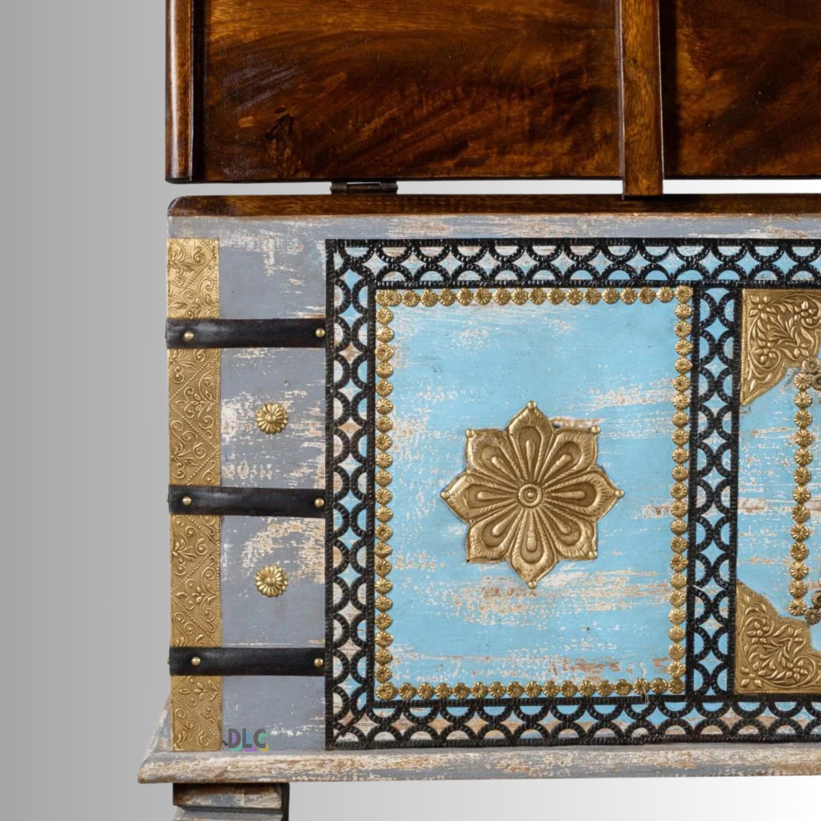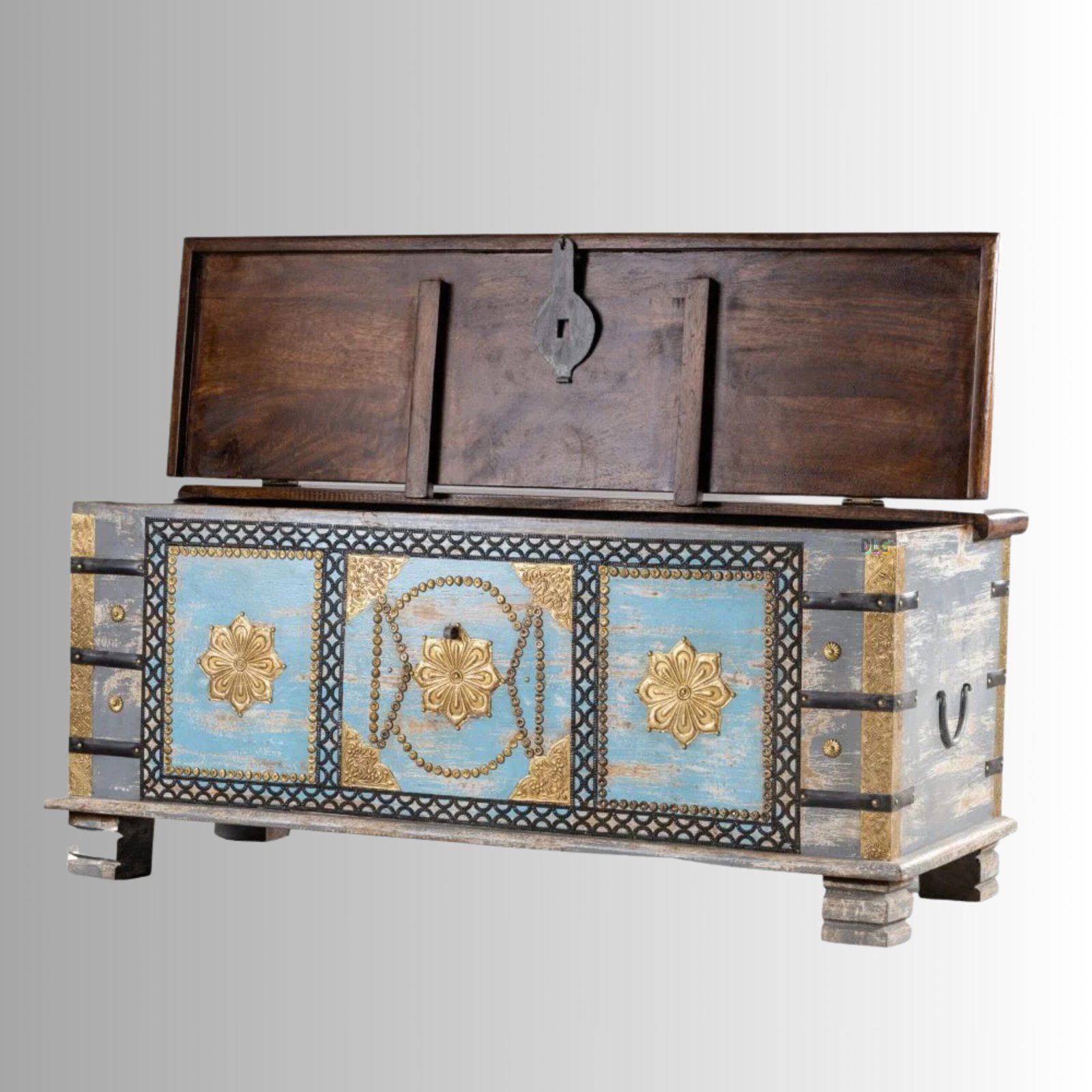 The grey distress finish with subtle antique detailing adds a rustic yet artistic character, making it a striking centerpiece for bohemian, ethnic, and eclectic interiors. Designed as a coffee table with hidden storage, it is both decorative and highly functional.