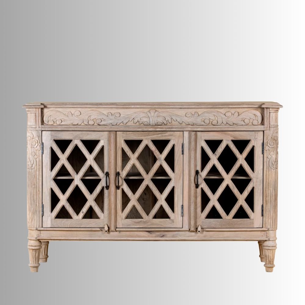 The Elanova Handcrafted Mango Wood Accent Cabinet (148 cm) is a refined storage piece crafted from 100% solid mango wood, designed to bring timeless elegance and artisanal charm into your living space. Carefully handcrafted by skilled artisans, this cabinet features elegant carved detailing and classic lattice-style doors, enhanced by a soft whitewashed finish that highlights the natural texture and grain of the wood. Built with premium-quality materials, it offers a strong, durable structure that balances beauty with everyday functionality.