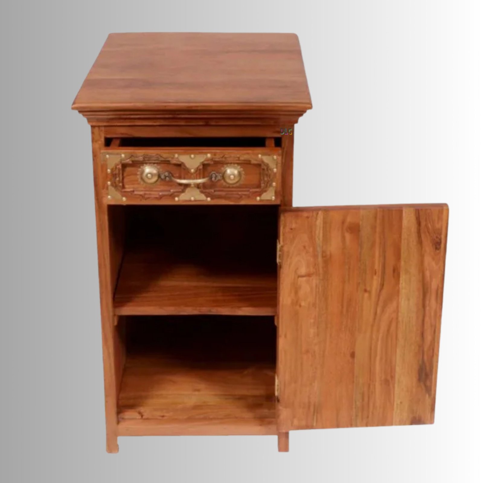 Bring timeless charm and artisanal elegance to your bedroom with the Exotic Heritage Carved Night Stand. Expertly handcrafted from premium solid acacia wood, this bedside table features intricate traditional carvings highlighted with classic metal accents, reflecting rich Indian craftsmanship.