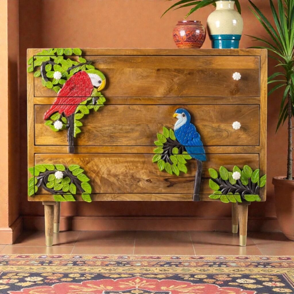 Pakshi Hand-Carved Bird Design Chest of Drawers | Solid Mango Wood, Multicolor Finish (36.2 × 29.9 × 18.5 in)