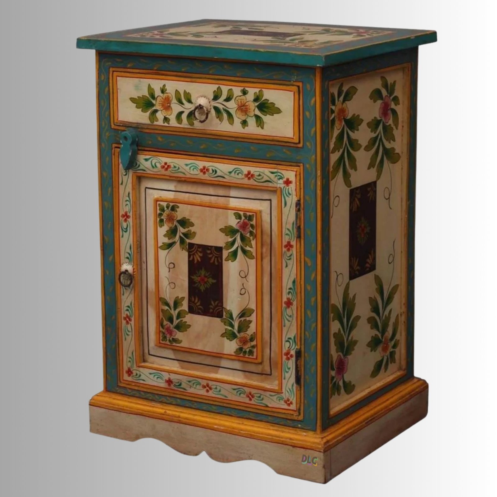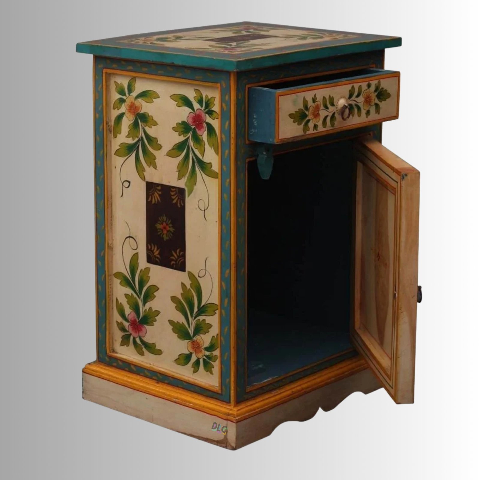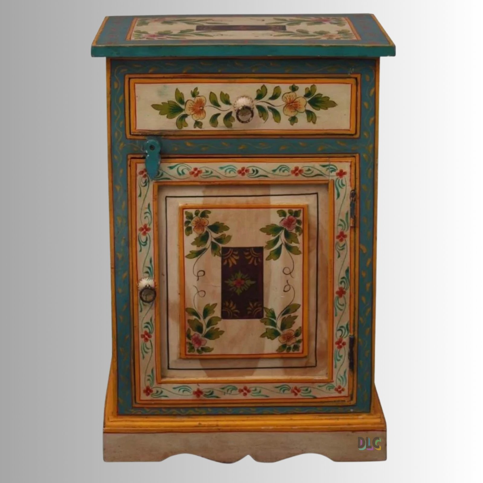 Painted Floral Multi-Color Mango Wood Bedside Cabinet with Drawer & Door