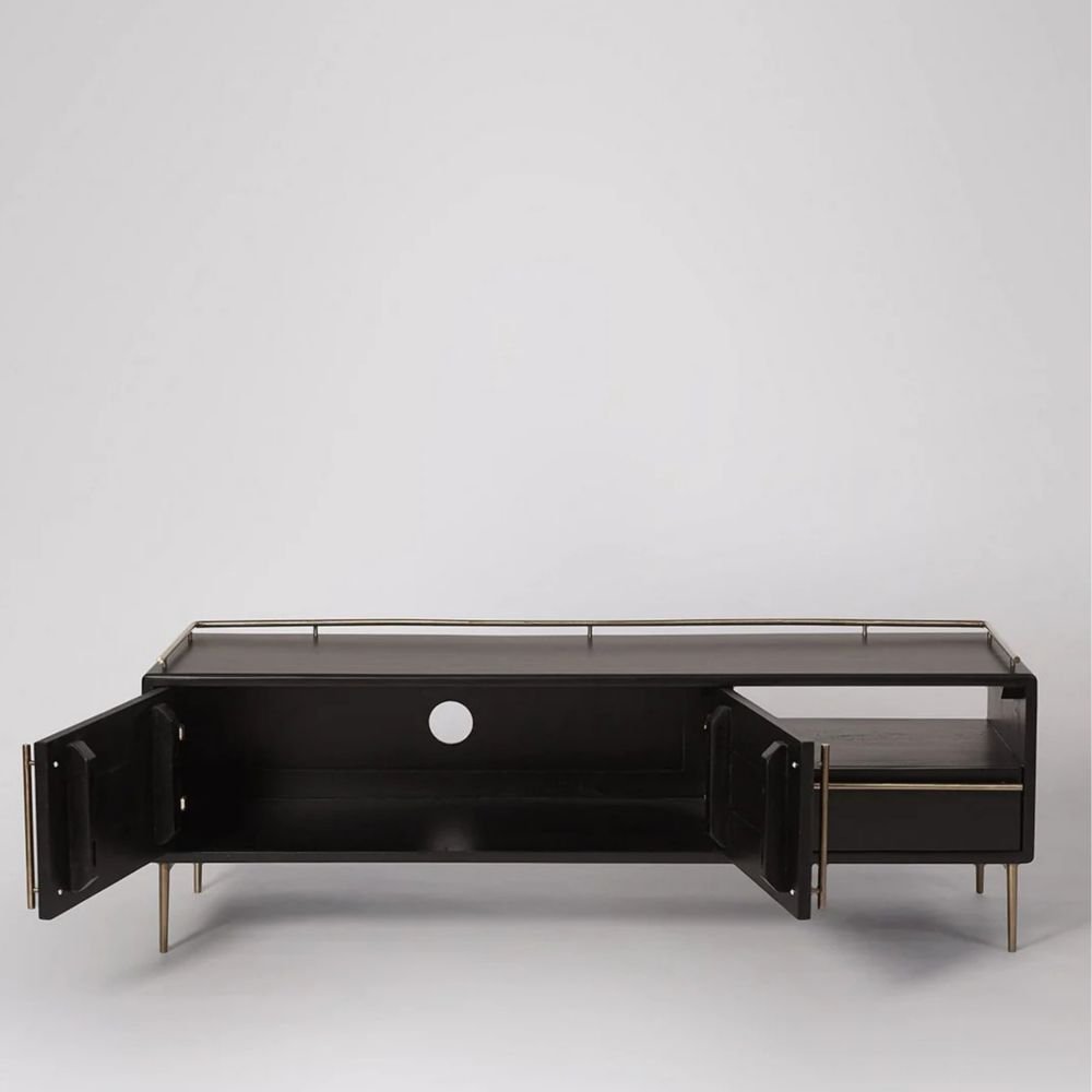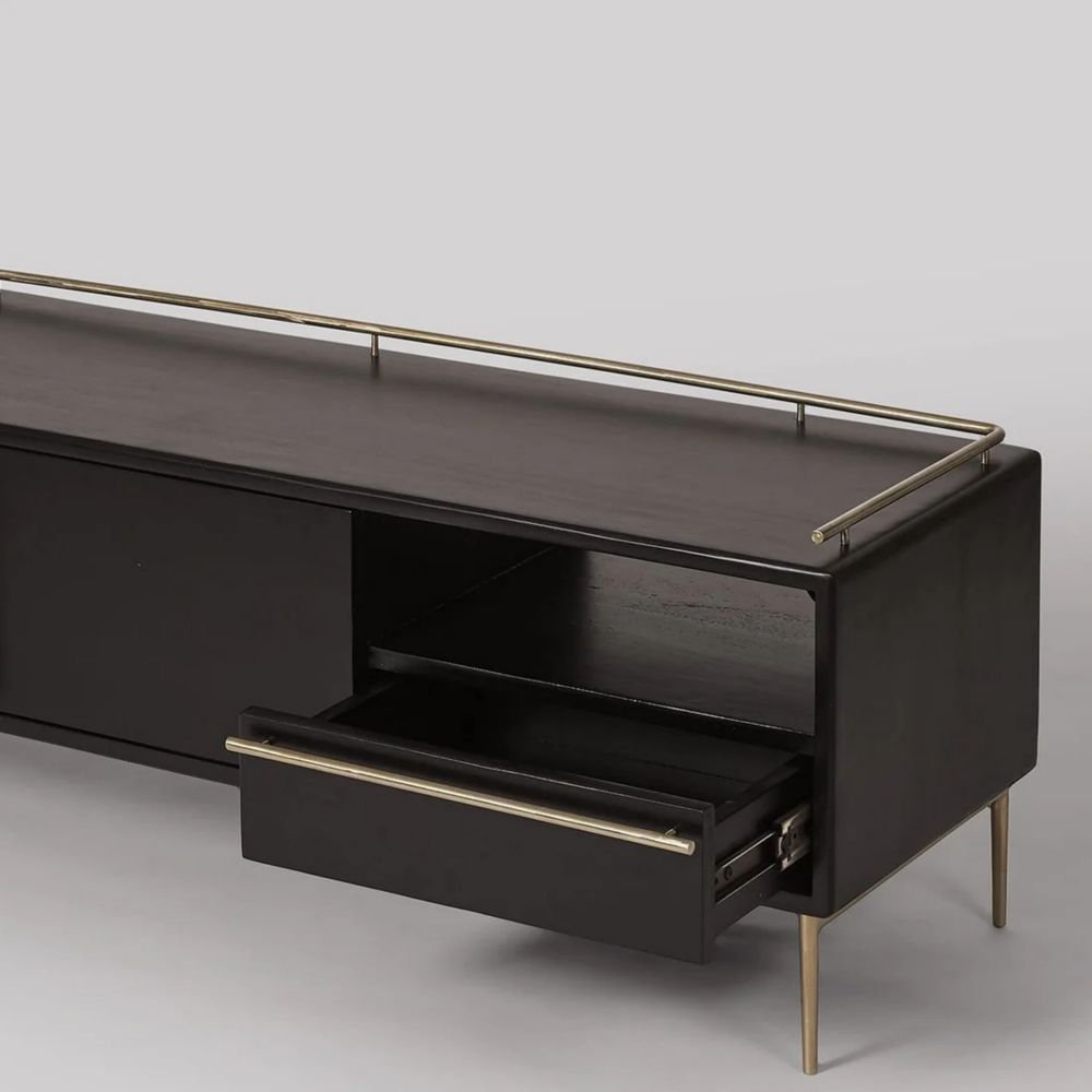The Solid Mango Wood TV Stand (116 cm) is a sleek and contemporary storage unit crafted from 100% solid mango wood, designed to bring modern elegance and durability into your living room. Carefully handcrafted by skilled artisans, this TV stand features a clean, minimalist silhouette complemented by a bold black finish that adds a refined, modern touch while highlighting the strength and quality of solid wood. Built with premium craftsmanship, it offers a sturdy and long-lasting structure ideal for everyday use.