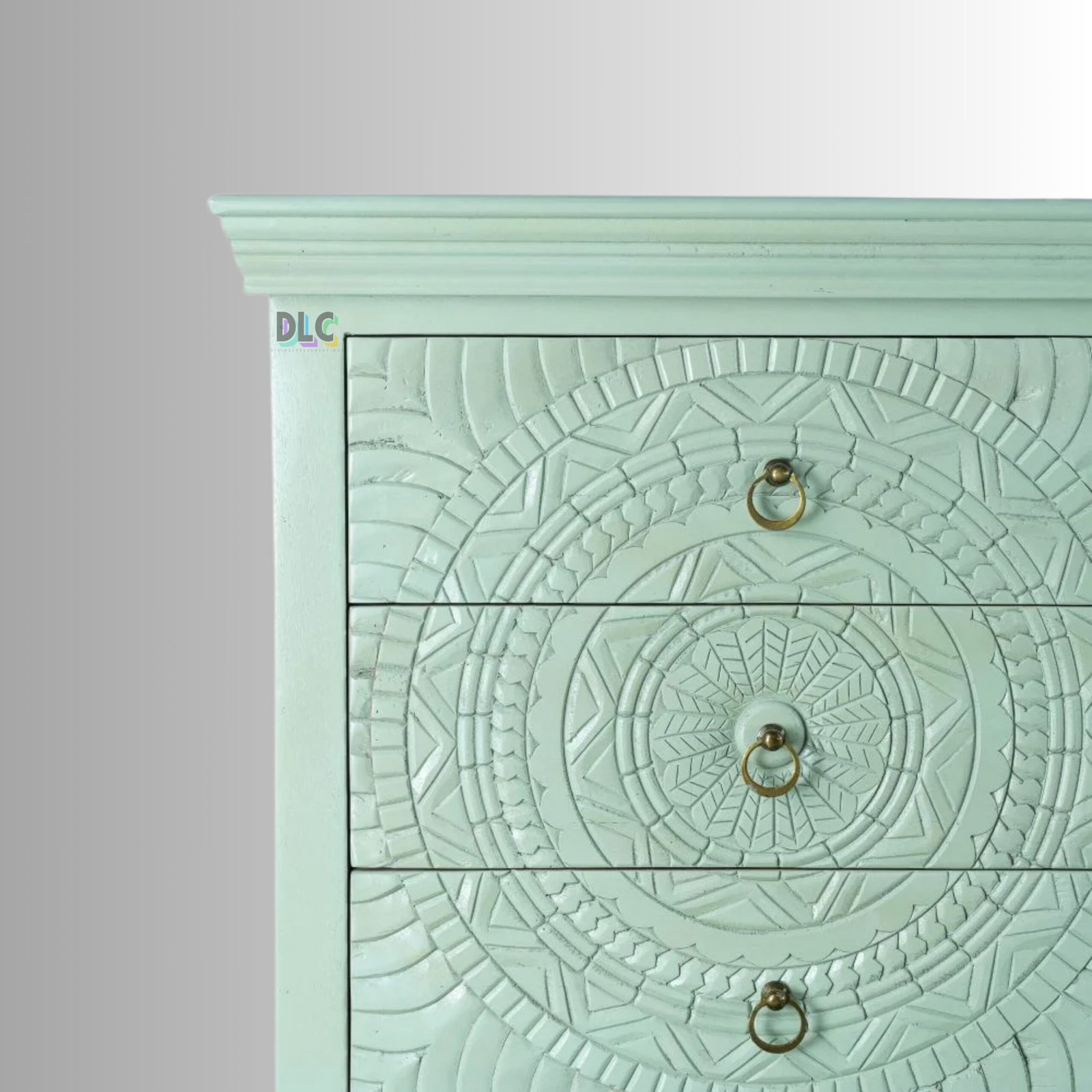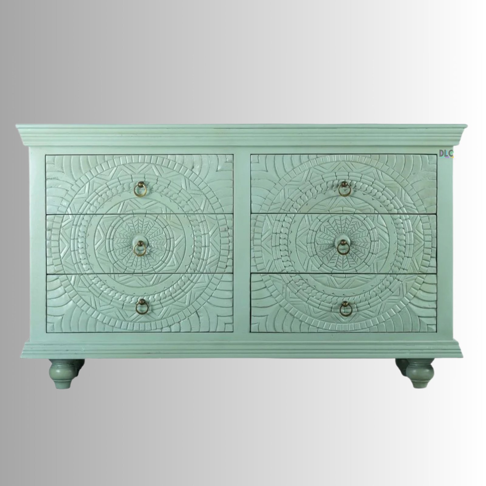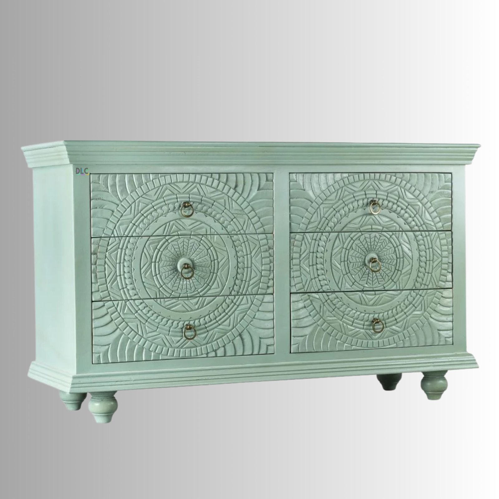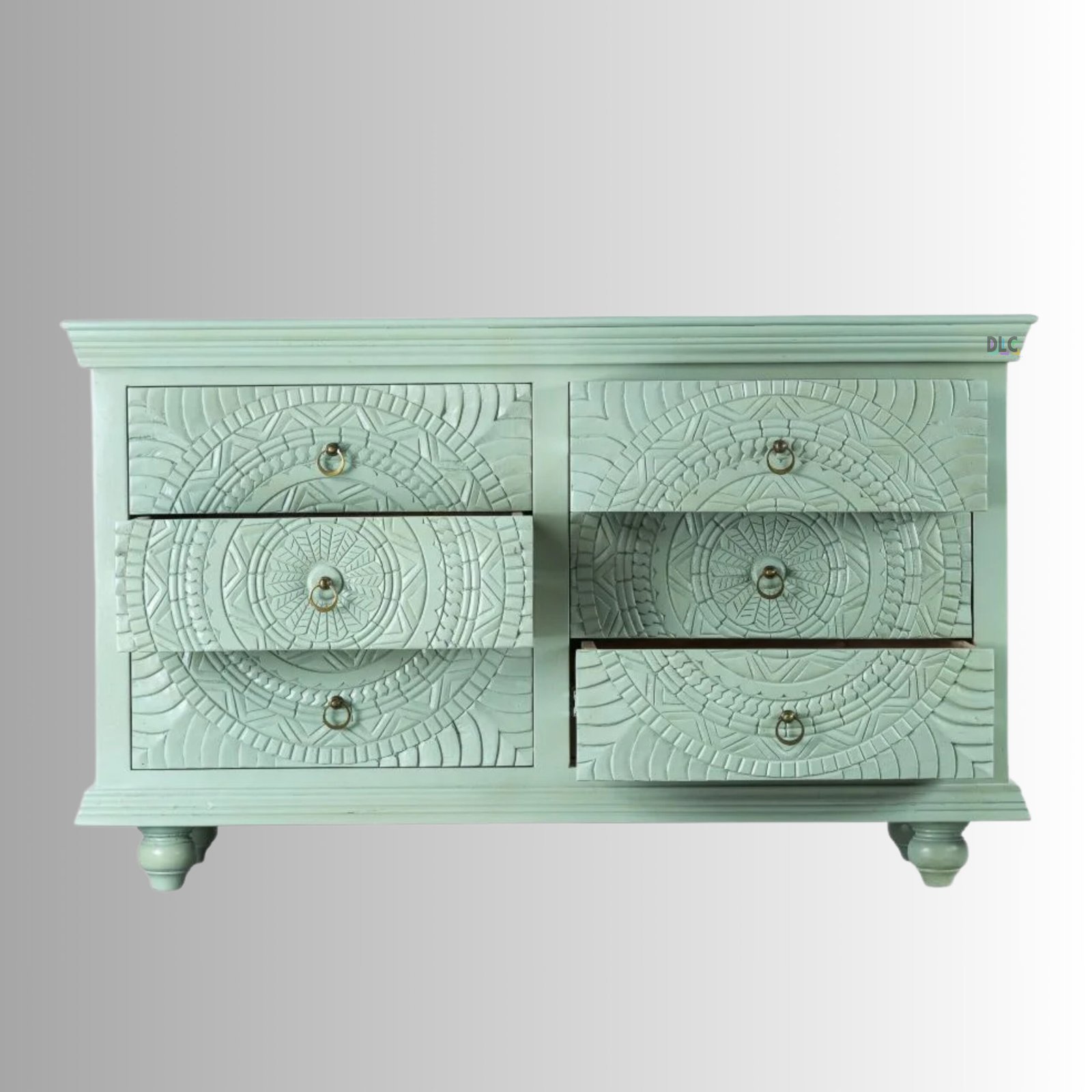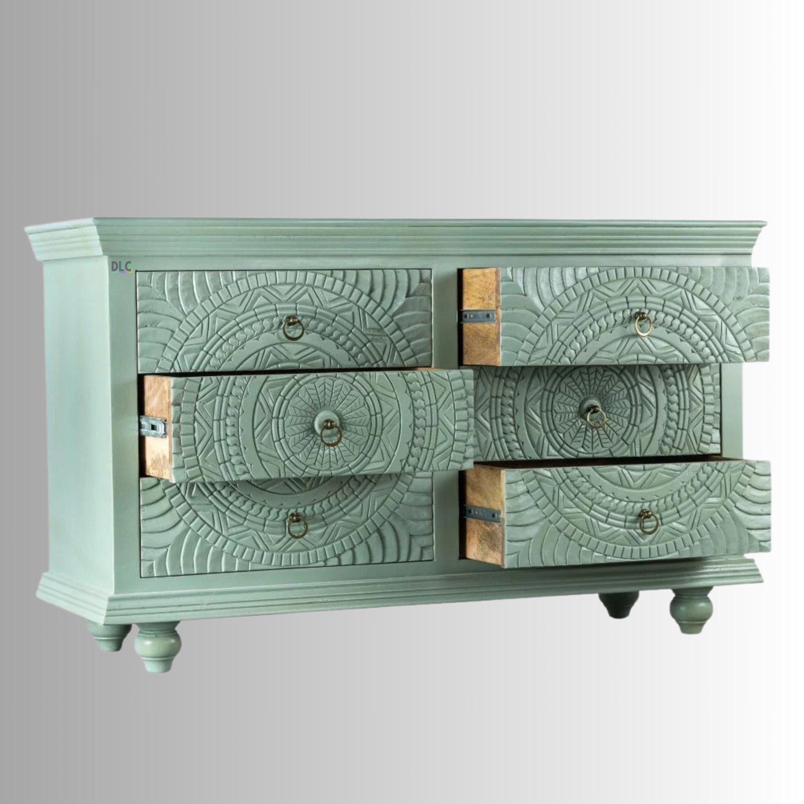 The soothing green finish adds a fresh, elegant touch while enhancing the carved detailing. Designed for both beauty and utility, it offers spacious drawers to organize essentials, making it a perfect fit for living rooms, bedrooms, dining areas, or entryways.