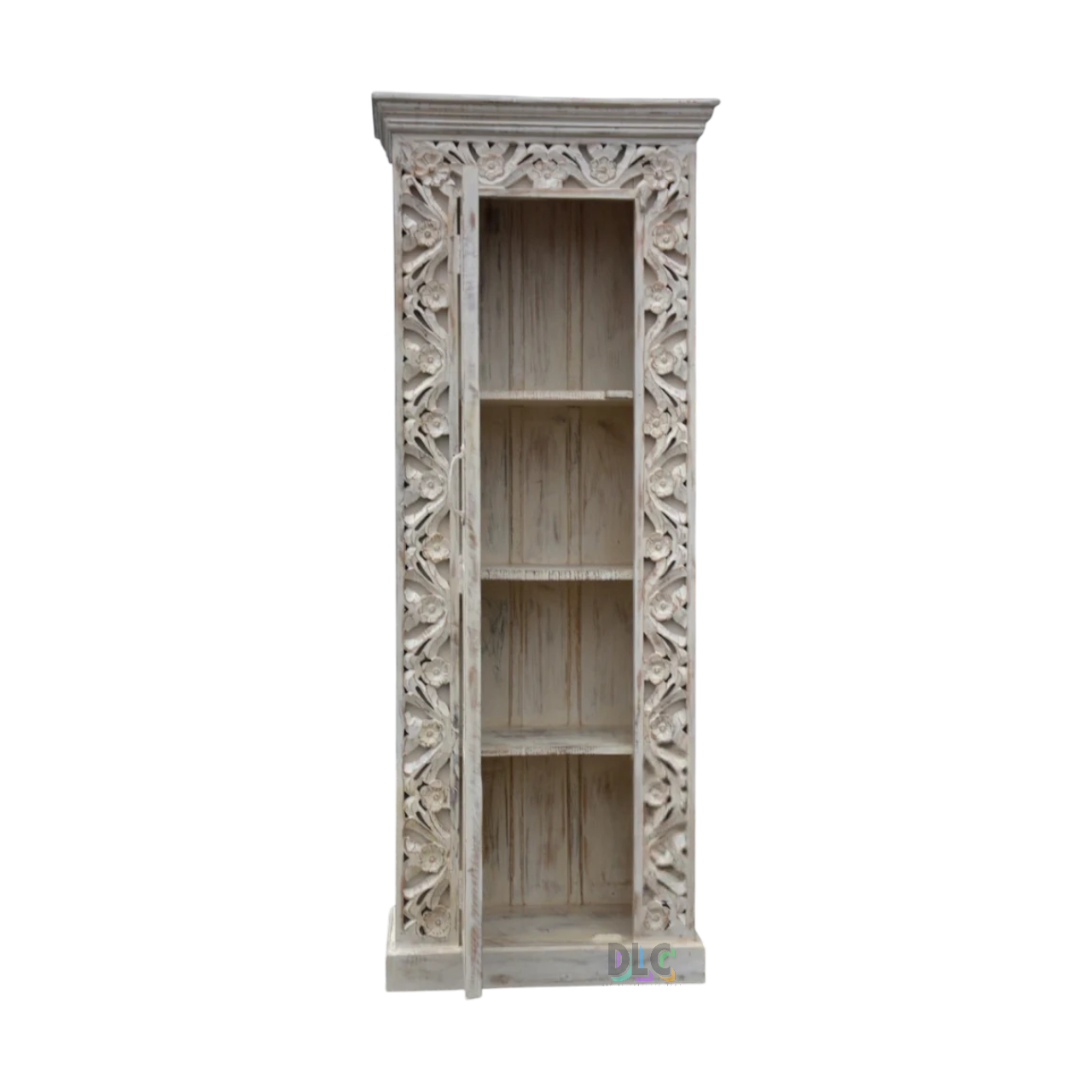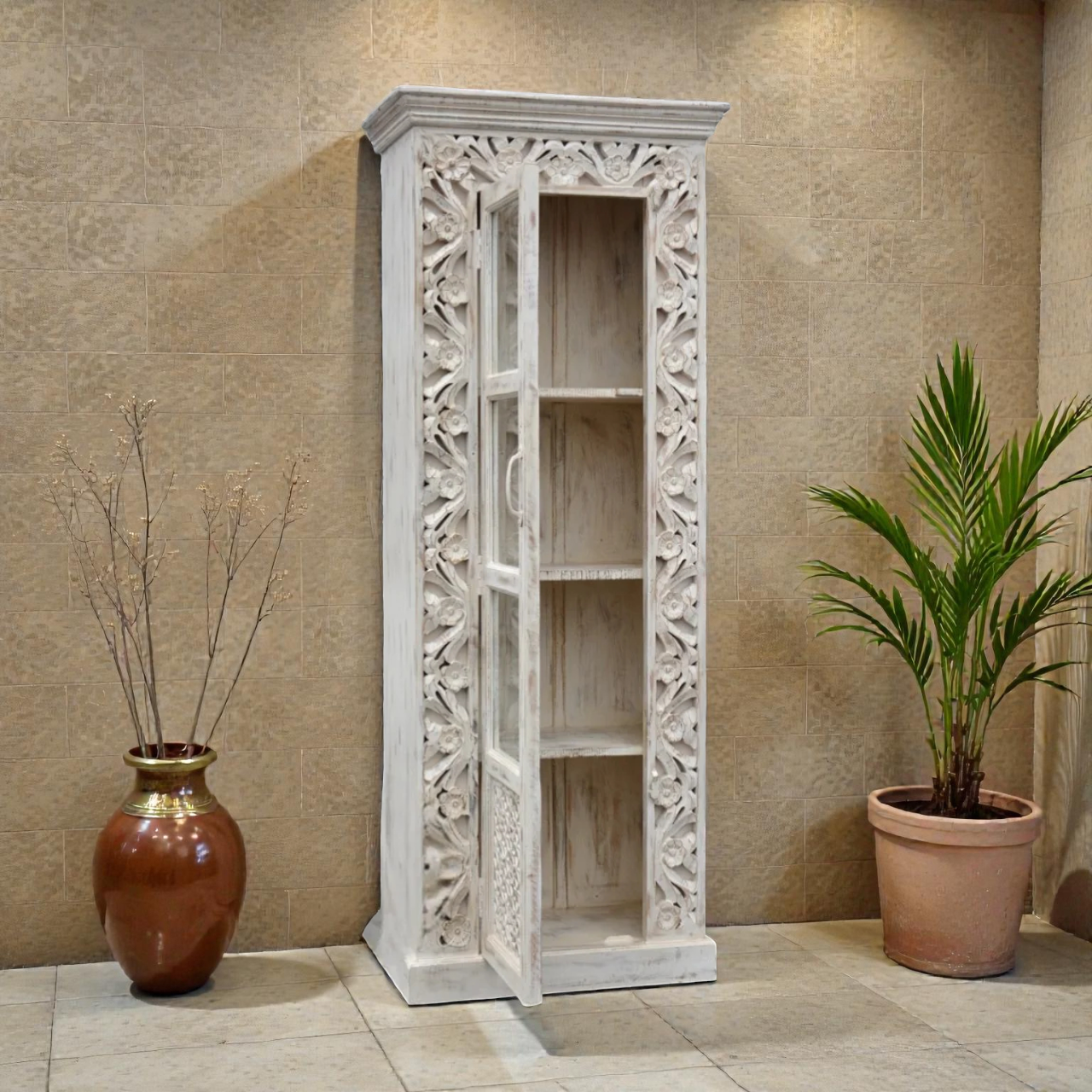 Vaishnavi Hand-Carved Solid Wood Display Cabinet | Whitewashed Finish with Glass Door