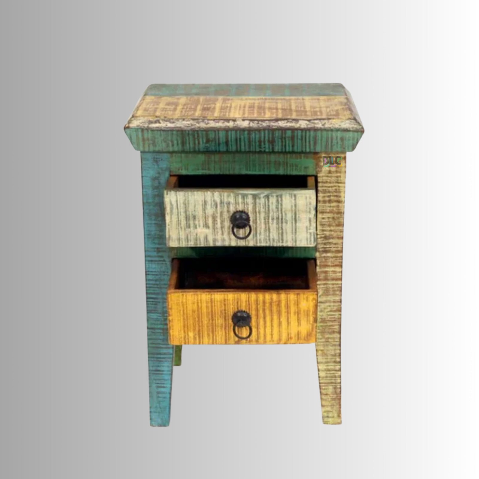 Bring rustic charm and artistic character to your bedroom with the Vintage Heritage Double Drawer Bedside Table. Handcrafted from solid acacia wood, this bedside table features a vibrant multicolor distressed finish that celebrates traditional Indian craftsmanship.
