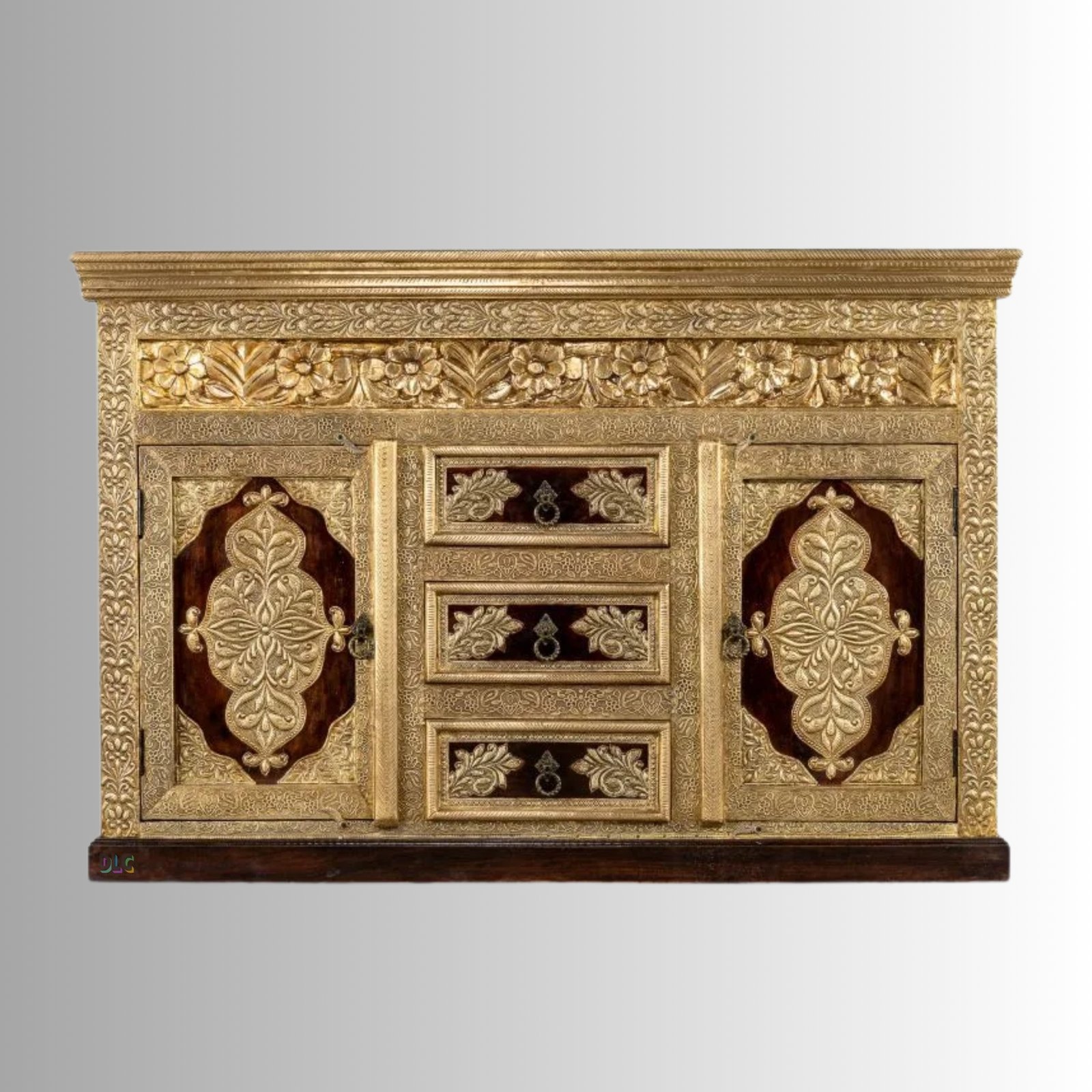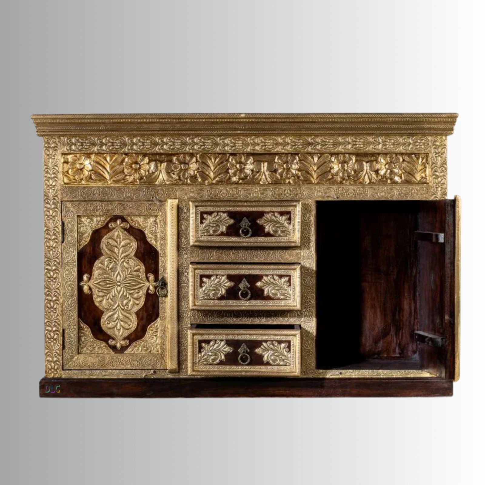 Enhance your interiors with timeless elegance using this Wooden Brass Fitted Sideboard for Storage in a rich teak finish. Expertly handcrafted from premium solid mango wood, this statement piece features intricate brass detailing and traditional carvings that reflect royal Indian craftsmanship.