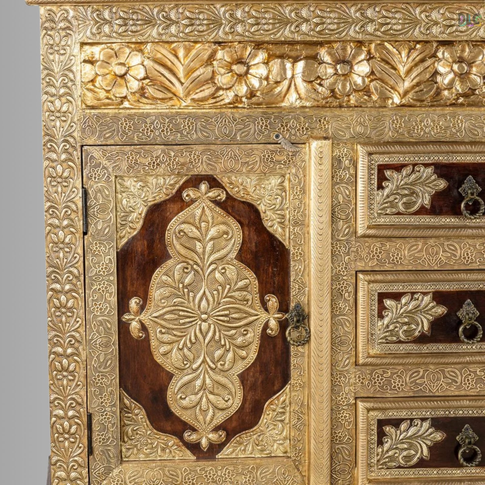 Designed with multiple drawers and spacious cabinets, this sideboard offers generous storage while elevating your living or dining space with luxurious appeal. The teak finish combined with brass fittings creates a bold, heritage-inspired look that blends beautifully with classic, ethnic, and modern luxury interiors.