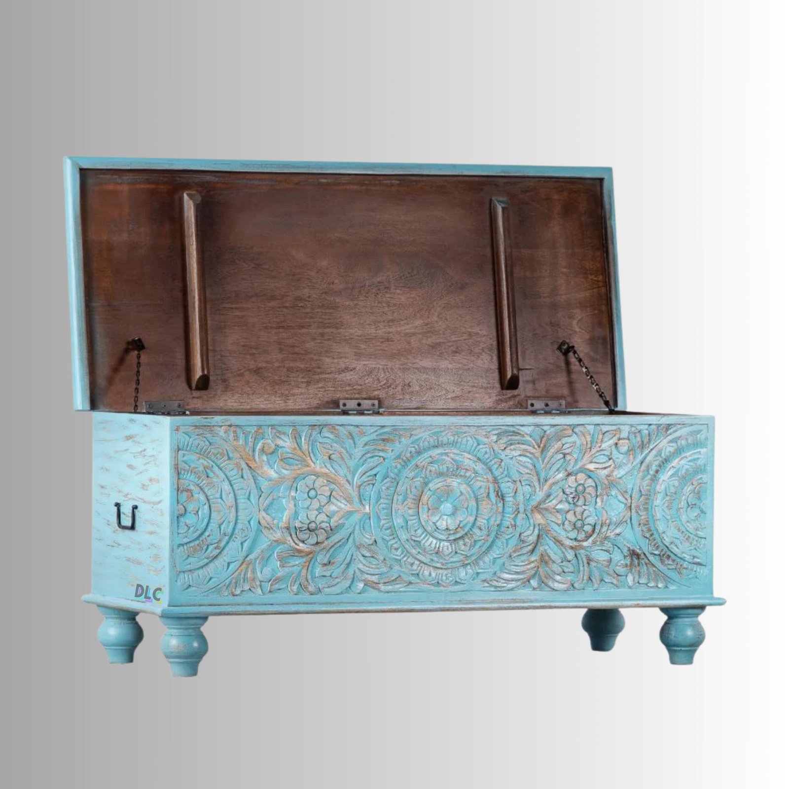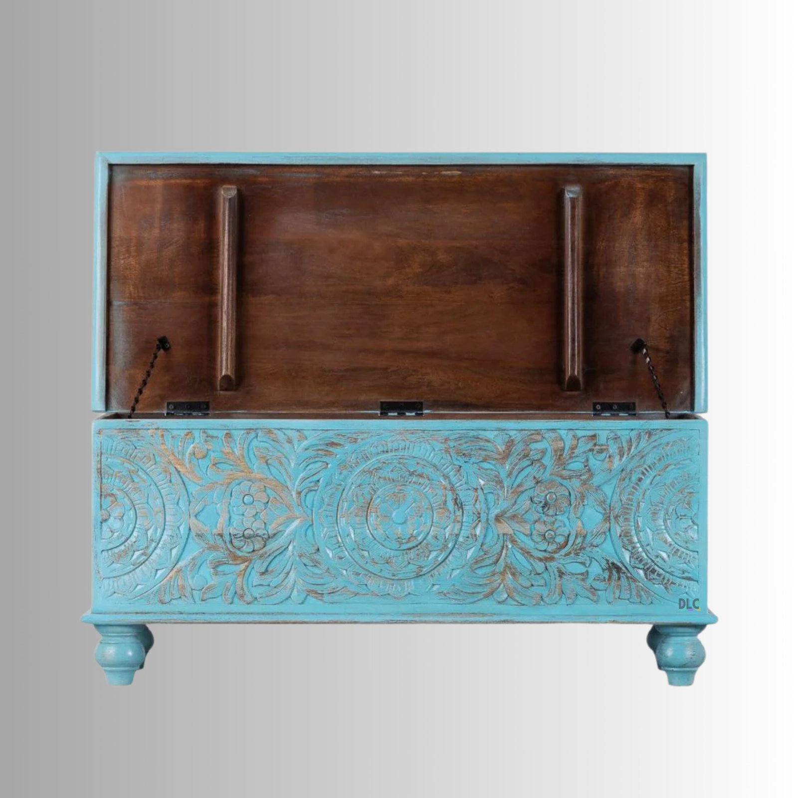 Azure Crest Carved Storage Coffee Table Trunk (Blue Distress)