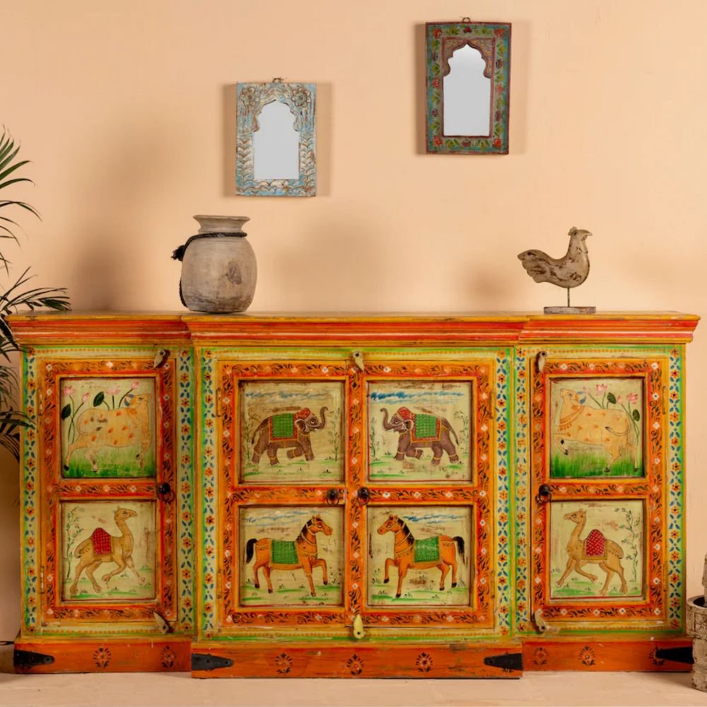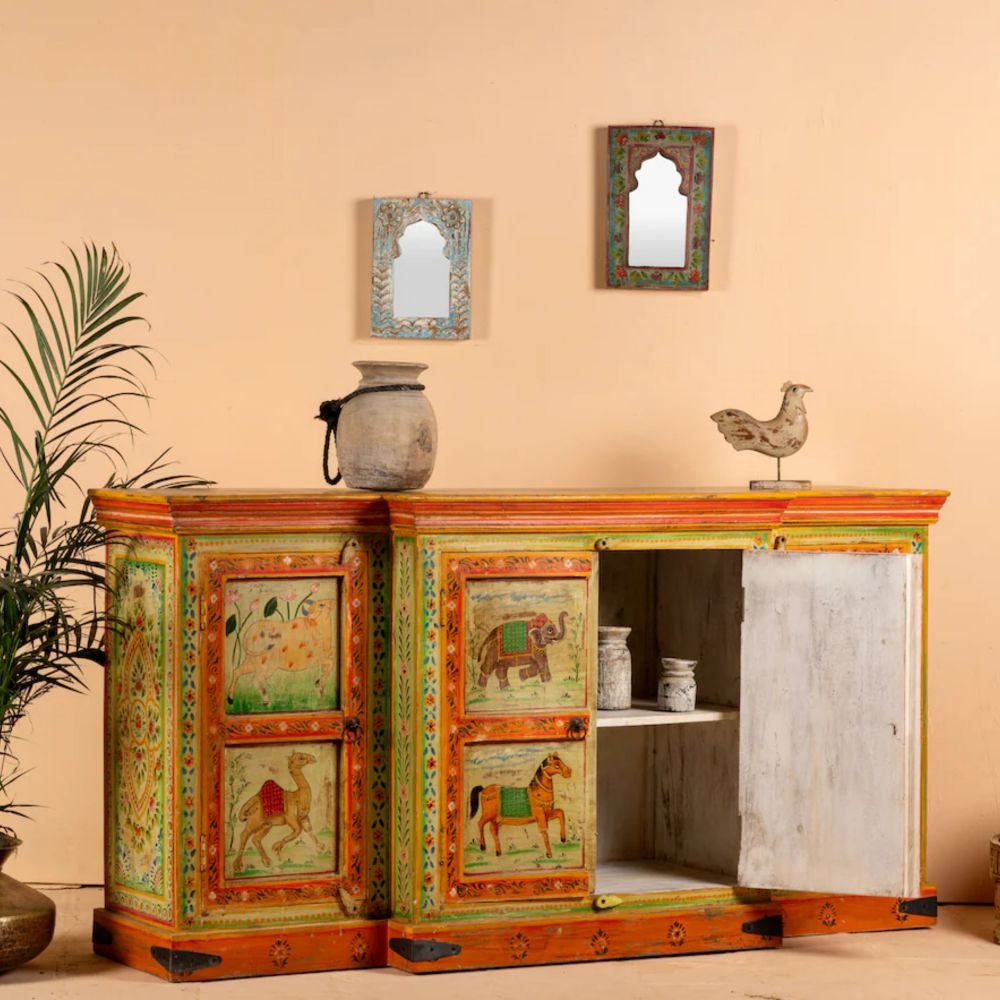 Perfect for Indian homes, the Zaviona sideboard provides generous storage behind beautifully painted doors, making it ideal for dining rooms or living spaces that seek a bold accent. Made from natural and eco-friendly materials, it is a responsible choice for homeowners who appreciate sustainable craftsmanship without compromising on design. Whether styled as a statement storage cabinet or a focal décor piece, the Zaviona sideboard delivers artistic elegance, practical storage, and timeless vintage appeal.